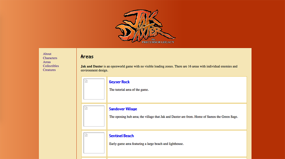 The first shrine I made was for Jak & Daxter, one of my alltime favourite games. I was obsessed with this game growing up and played it over and over (alongside the original Crash Bandicoot and original Ratchet & Clank). I had a vision of a mini wiki, and with my new experience working in Javascript I had a clear image of how to lay out all the code. It's very exciting to have a better understanding of how to efficiently lay out a site without needing to clunkily import whole .html files (which is how my header and footer used to be set up on this site). The biggest lightbulb moment for me was understanding how to setup side menus on this site, and I had a grand vision of multiple sidebars linking to relevant pages depending on what page you were on. It was going to be so cool!