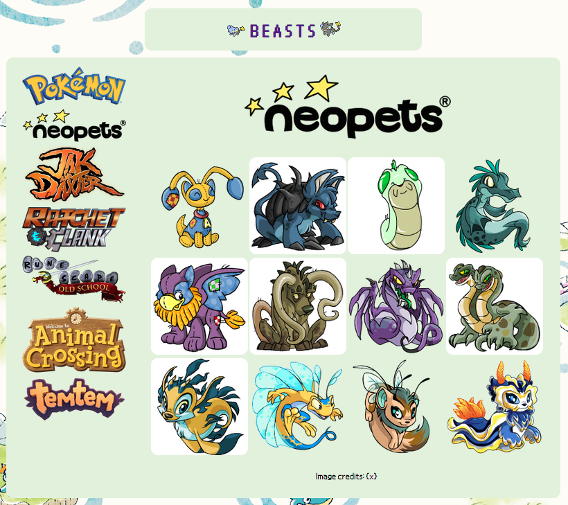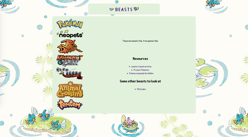 I definitely had the most fun putting this shrine together out of all three. It was much more lowstakes than the Jak & Daxter shrine because I wasn't trying to include information, I was just going down memory lane looking at pictures of neopets and Animal Crossing villagers. I remembered a little while ago a Pokemon archivist had pulled all the Pokemon Shirt designs from the now-defunct website, and I correctly thought one of those would make a nice background for my BEASTS - you can check out the design archive here! There's a lot of really cute stuff in there. I went through every single shirt design (look, I really like doing very long boring projects like this) and actually pulled twenty different designs with the intention of finding a script to randomly change the background on every refresh, but got tired of trying to look that up and went back to the important stuff: uploading pictures of little guys.