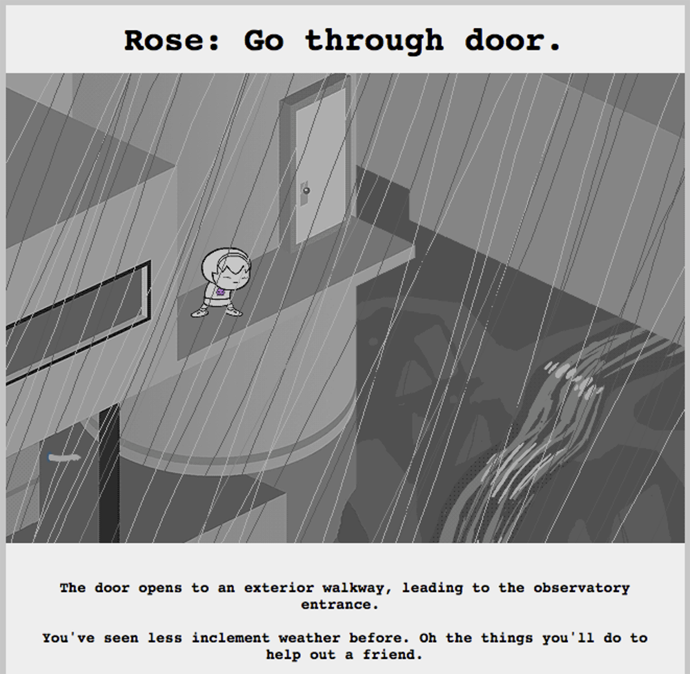 When discussing webcomics and their breaking of traditional comics format, it is near impossible to go without mentioning Homestuck[4], a sprawling behemoth of a story created by Andrew Hussie. Homestuck spans 8126 pages, featuring 14,915 panels and 817,925 words[5], and ran from 2009 to 2016. The standard layout for a page was a single textless panel of consistent size with an accompanying caption, either written as narration in the second person or with character dialogue, written as a chatlog. These pages are reminiscent of early comics featuring a single image and a related caption underneath – Töpffer’s 1842 comic M. Vieuxbois, for example.