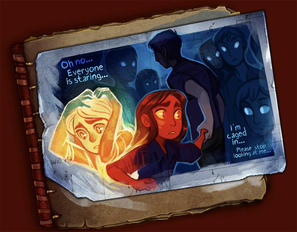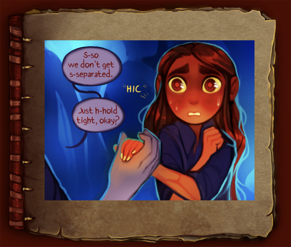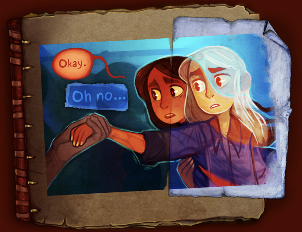 The consistent panel size of this style of comic seems to act almost as storyboards, acting out moments beat for beat and perhaps therefore losing out on the effect of the gutter and panel size to convey time and importance of moments. Ava’s Demon is able to avoid layout stagnation by altering the panel shape and orientation to indicate mood shifts. The standard page is a panel displayed within a book, as shown on page 1129.