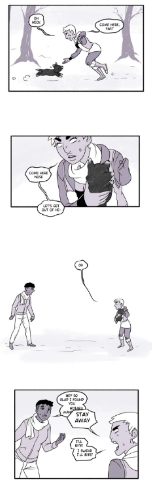 In conclusion, webcomics are able to make use of extra-narrative elements that are not present in traditional print comics. These elements include varied page size and orientation, site layout, retcons, controlled pace of reading, and animation. These elements may not be necessary to the story but serve to more deeply immerse the reader, such as in Follow the Leader , or may act narrative devices intrinsic to the story, such as in When the Darkness Presses. For these reasons, it is laughable to say that by simply reading a comic on a screen one is engaging in an inherently lesser form of comics. The extent to which webcomic creators have explored the possibilities of the screen is fascinating, and yet there are are always new and exciting ways to make use of the digital medium. Comics and zines have already found popularity among marginalised creators due to their accessible nature but webcomics, most of which are free to read online, are even more accessible to both readers and creators alike. A large number of webcomic creators are queer and/or creators of colour, and are therefore able to share their experience and stories without having to worry about editors or finding a publisher willing to take on the material. These stories are finding an enthusiastic audience with readers who have thus far been let down by mainstream or traditional comics. With the endless potential of technology and hundreds if not thousands of webcomics still to be created and artists and writers whose stories are yet to be told, it will be a delight to see how webcomics continue to break free of the constraints of traditional comics.