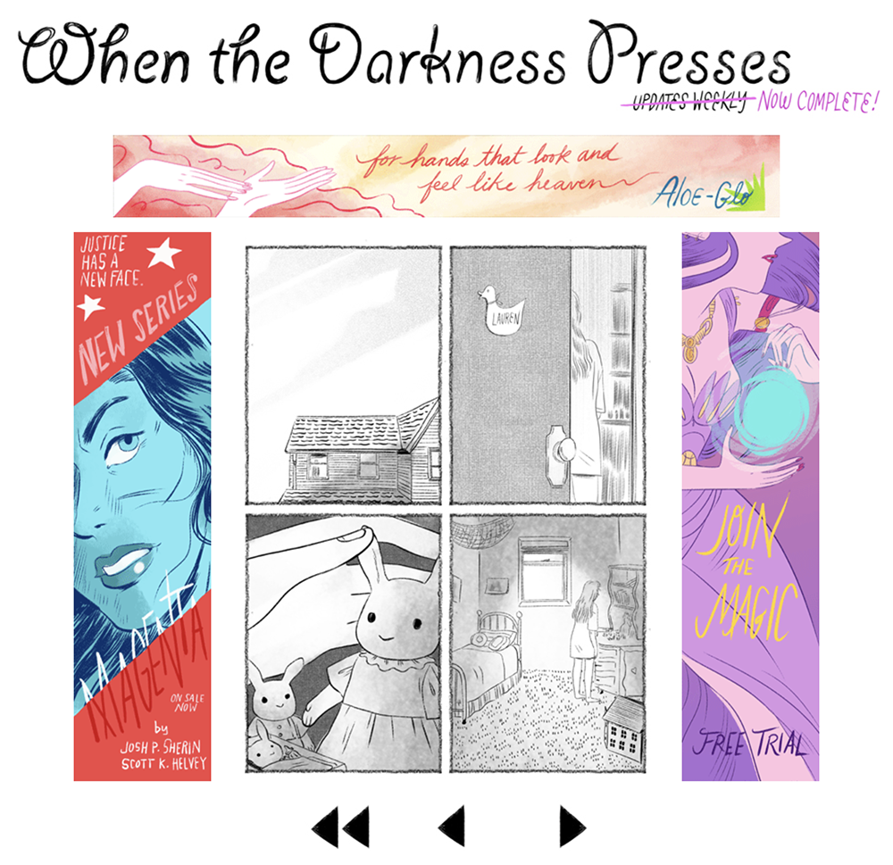 As well as playing with both traditional and non-traditional comic formats, webcomics can make use of a number of extra-narrative elements that enhance the reading experience. The first of these, and perhaps the most obvious, is the site layout and its related features, such as the site URL and navigation buttons. While the site can act as a hub for the comic and is therefore often designed to match the theme of the comic, the layout can also be inextricably interwoven with the narrative, as with When the Darkness Presses. The daytime scenes mimic a traditional webcomic site layout, with the title and update schedule at the top and fake advert banners surrounding the page itself. The nighttime scenes, however, revert to Carroll's eerie vertical scrolling pages with stark black backgrounds.