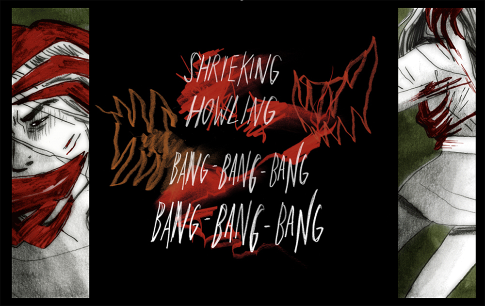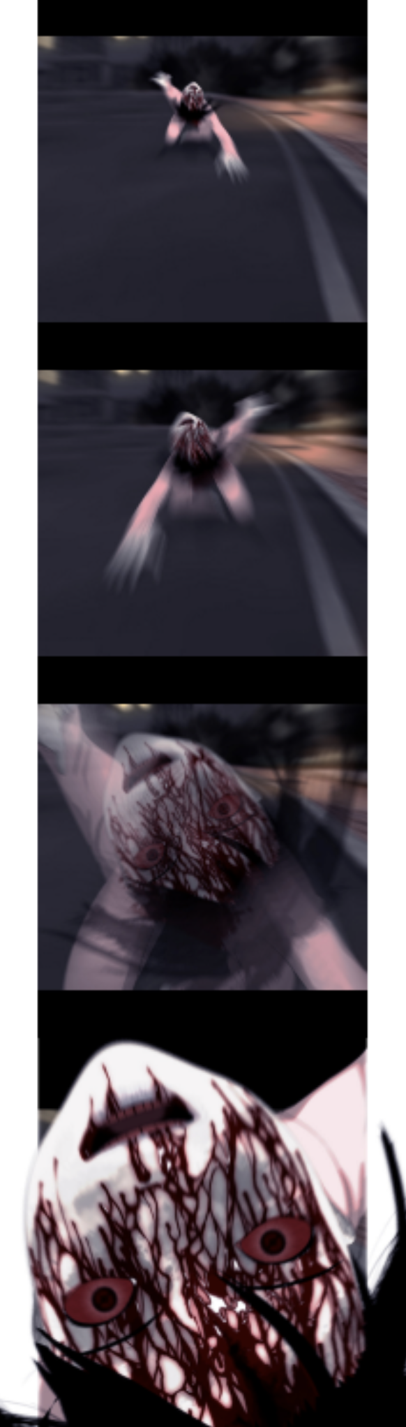 A feature unique to comics, one that most readers take for granted, is the controlled pace of reading. Unlike moving image or traditional literature, a comic reader can control the pace at which events unfold by lingering or skimming over panels as they desire. Where an artist can stretch or squash time by increasing the number of panels a moment takes up or diminishing it to a single panel, it is ultimately up to the reader how fast time actually passes, including when to turn the page. Japanese horror artist Junji Ito makes use of the reader’s control over the narrative to his advantage in many of his stories, as video essayist John Walsh explains: “Right when something bad is about to happen, [Ito] always gives us this little panel right at the bottom of the page of our character reaction to something unseen. And then it’s up to us to turn the page[15].” By handing the reins directly to the reader, Ito is using the traditional comics medium to create more fear, or a different kind of fear, than possible in mediums such as film where the viewer is not at all in control. Webcomics can create a similar effect by forcing a reader to choose when to click to the next page, such as in Carroll’s work, but it is also possible for them to wrest control entirely out of the readers’ hands. This is especially effective in the 2011 horror comic Bongcheon-Dong Ghost[16] (right), created for Korean webcomic publisher Naver Webtoon. As is standard for Korean webcomics, the comic is comprised of single panels arranged vertically and the reader must scroll down to read, but at certain moments the site takes over and suddenly speeds up the scrolling to zip past several panels, creating the effect of the ghost turning around or rushing at the reader. This sudden movement, paired with the sound of the ghost and the fact that the final panel of the second jumpscare has the ghost moving past the boundaries of the panel border that the rest of the comic stays behind, is frightening because it is unexpected not only because it surprises the reader but also because it creates a sense of helplessness in a medium where the reader is usually entirely in control.