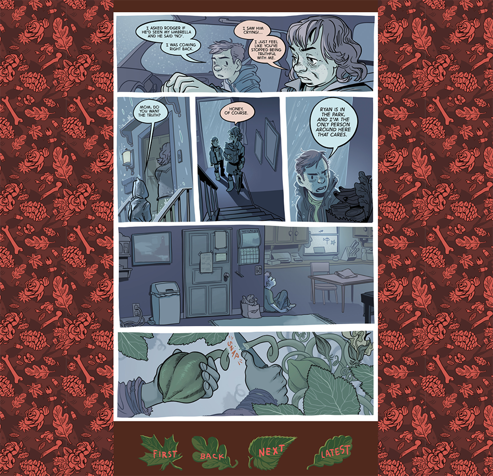 Another example of the successful manipulation of site layout can be seen in American creator Jonas Goonface's Follow the Leader[12]. This webcomic is formatted in a more traditional page style and tells the story of a town haunted by the child cannibals that live in the adjacent forest. The forest is a constant presence in the back of the townsfolk's minds, and it becomes present in the reader's mind too; the looming threat of the surrounding forest is reflected in Goonface's stark choice of site layout, endlessly reminding readers by the intense layout that frames each page and navigation buttons, which are shaped like leaves rather than directional arrows. As a result, the town of the comic is one of constant unease, even when the scene is not taking place in the forest itself or no violence is being depicted on the page. Print copies of Follow the Leader are available and of course these lack the background found on the site, resulting in a different and potentially less involved reading experience. It is clear, however, that Goonface makes use of the layout to convey the theme and tone of the comic and thereby add a layer to the reader's understanding of the story.