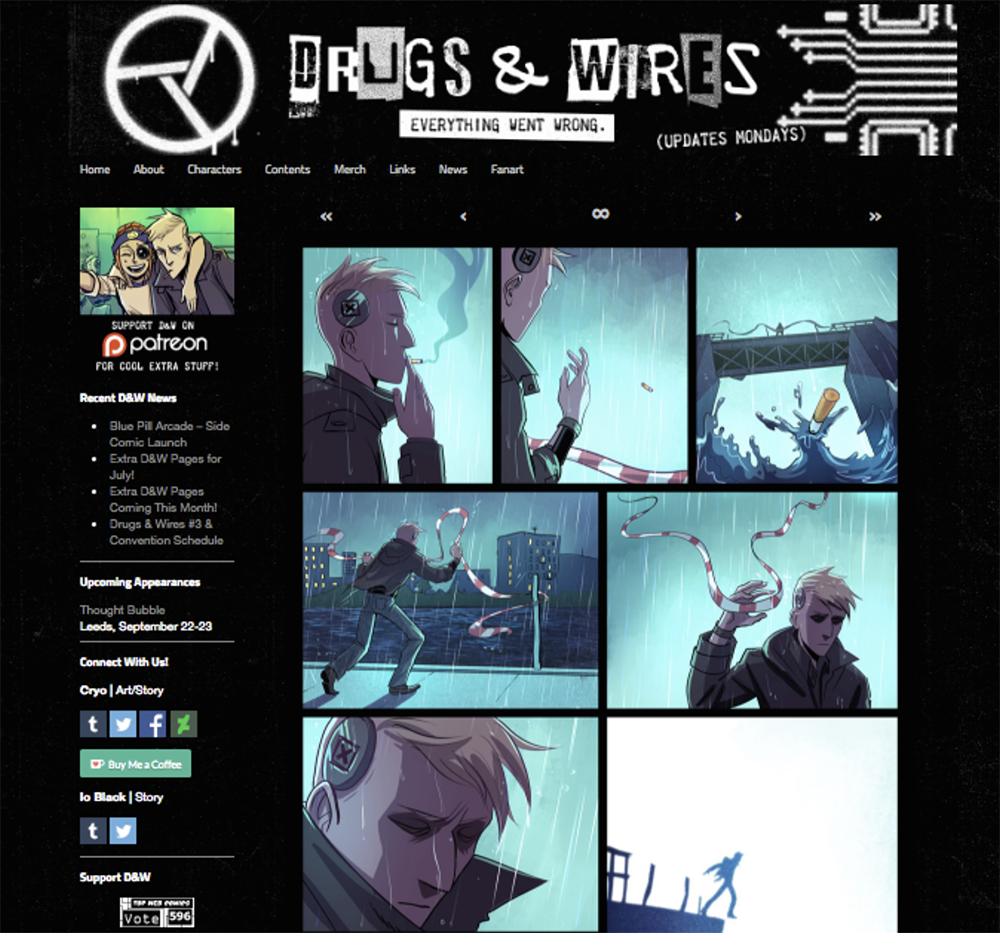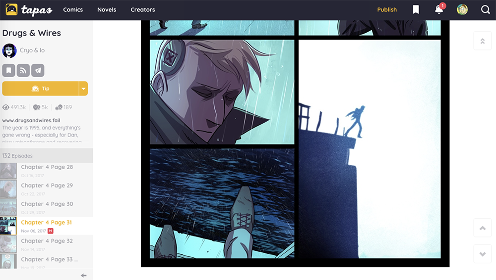 Considering that a site layout can certainly work with a comic's tone or act as part of the narrative itself, it is then interesting to discuss whether or not a layout can detract from the reading experience. A print comic can exist as a separate physical object, but a webcomic is tied to its layout. Although some webcomics are housed on their own sites, as seen previously, other creators may choose to upload or mirror their comics on subscription sites with a pre-existing reader base. These sites often do not allow custom layouts, however, and pages may lose their impact as a result. Compare, for example, the following pages from Drugs & Wires[13], by Latvian artist Mary Safro and German writer Io Black, the first of which is posted on the main website and the second on Tapas, which they are using as a mirror site. In this page, the main character, Dan, is attempting to commit suicide.