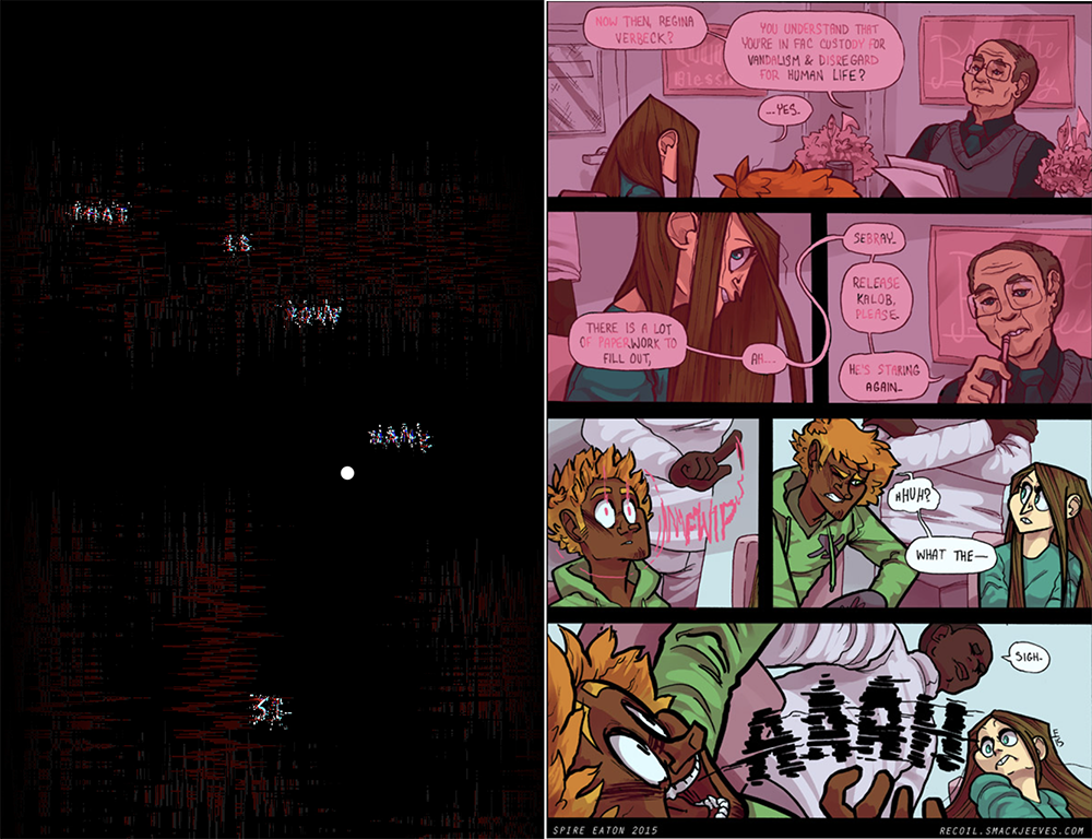 Another feature of webcomics that cannot be translated into in print comics is retconning pages - that is, playing with retroactive continuity. This can be done with narrative, of course, but not with the actual physical comic itself. One of the most interesting examples of this is in Recoil[14] by American creator Spire Eaton. Recoil follows a boy called Kalo who discovers he has superpowers and is taken to a medical facility. Over the course of the comic, we discover that, unbeknownst to him, he is being hypnotised by the head of the facility, resulting in disorientation and loss of memory. Eaton extends this disorientation to the reader by retroactively adding pages that indicate Kalo is undergoing hypnosis between scenes that, when the pages were originally sted, the reader was not aware of. The page on the right shown here was originally the first page of the third chapter, where Kalo first arrives at the facility. The reader was aware that he was being controlled like a puppet in order to be brought there, but did not yet know that he had also at this point undergone hypnosis. When it was revealed two and a half years later that he was being hypnotised, Eaton added the page on the left just before page 1, titled “page 0131”, Kalo’s number in the facility. Such additions were not pointed out and work to disorient those who have been following the comic and choose to reread, making them wonder if their memory is as faulty as Kalo’s. Other changes included making letters in the site banner occasionally flicker and change into the number 31. These extra-narrative details heighten the reading experience, particularly for regular readers rather than those who read the comic all in one go.