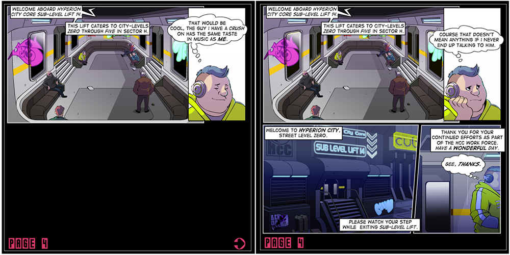 Controlling the reading pace does not have to be a negative thing, however. Casey J.’s webcomic Buying Time[17] acts as part animation, part comic, with one panel or speech bubble appearing at a time and the reader having to click to make the next panel appear. While at first glance one would imagine that the comic could be fully replicated in print form, it is not so simple; some panels include small animations, such as an elevator arriving, or a single panel will cycle through a couple of different speech bubbles as the dialogue goes on, as seen below, meaning that one cannot read a “finished” page and get the whole story. Not only is this a creative way to manipulate the time a reader must spend on a single panel or moment, but it further demonstrates the ways digital comics can play with elements that are predetermined in traditional comics.