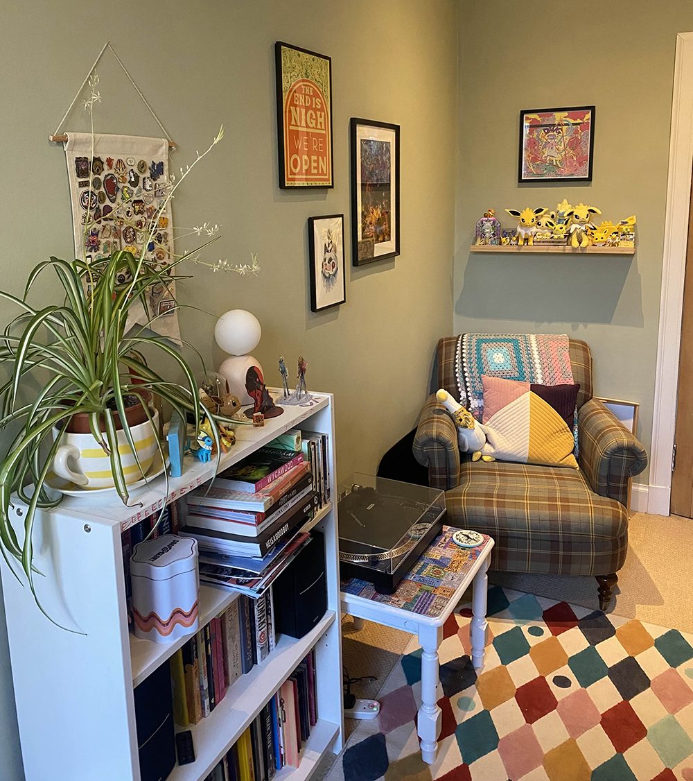 • I gave my studio a wee makeover! I've been very jealous of some of my friends' studios for a while and wanted to spruce mine up. I had a second desk and huge shelf of Quindrie books and supplies stuffed in here with me, but this year I finally shifted all that out into another room and set up a cosy corner for friends to join me for work hangs, or for my partner to hang out with me while I do admin. I now actually look forward to spending time in here and I love it! Gaze upon my jolteon shelf. I have like 50 jolteons.