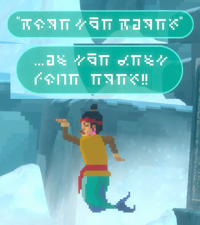 When I first saw this little conscript in the game, I was immediately excited. You know me (or you don't and you're about to). You know I love a conlang, and I was like hopeful that this would be a fun element used throughout the game. And it was! It's used a whole bunch! The fact that the sea people speak a different language is even a plot point, and you need to go find the parts to build a translator!